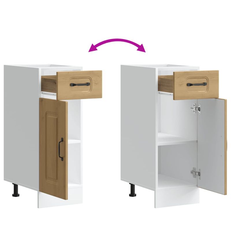 Този кухненски шкаф оптимизира пространството в кухнята ви, като осигурява достатъчно място за съхранение на личните ви вещи! Стабилен и издръжлив материал: Инженерната дървесина е издръжлив и стабилен материал с гладка повърхност, която е устойчива на влага, изкривяване и разцепване, което я прави надежден избор за различни проекти.Голямо пространство за съхранение: Основният кухненски шкаф предлага достатъчно място за съхранение на купи, чинии, тенджери и други кухненски уреди.Практична врата: Вратата помага за поддържането на чисто и организирано пространство, като скрива кухненските уреди и разхвърляните вещи зад тях.Регулируеми крачета: Крачетата на този шкаф могат да се регулират по височина, за да отговарят на разположението на кухнята ви.Лесна поддръжка: Благодарение на гладката си повърхност този кухненски шкаф се почиства лесно с влажна кърпа и изисква по-малко поддръжка. Внимание:За да предотвратите преобръщане, този продукт трябва да се използва с предоставеното устройство за закрепване на стена. Добре е да се знае:Винт(ове) и щепсел(и) за вътрешността на стената не са включени. Търсете и използвайте винт(ове) и дюбел(и), подходящи за вашите стени. Ако не сте сигурни, потърсете професионална помощ. Прочетете и следвайте внимателно всяка стъпка от инструкциите.