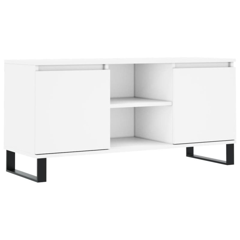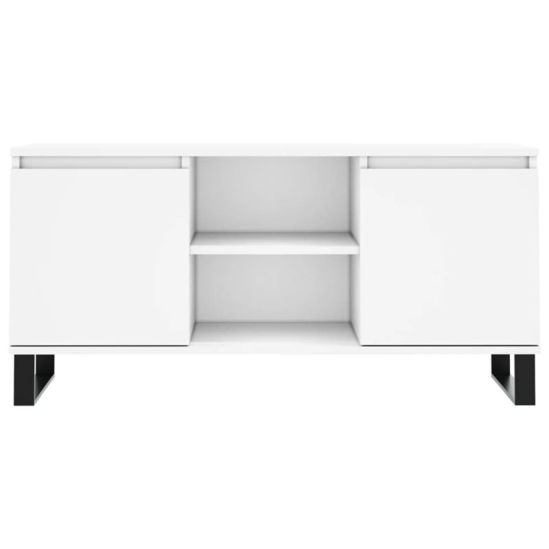 Този ТВ шкаф с достатъчно място за съхранение е практично и атрактивно допълнение към вашата всекидневна или спалня. Издържлив материал: Инженерната дървесина е с изключително качество с гладка повърхност и също така се отличава със здравина, стабилност и устойчивост на влага. Изработена от инженерно дърво, ТВ поставката се почиства лесно с влажна кърпа.Достатъчно място за съхранение: Тази ТВ поставка има 4 отделения, предлагащи достатъчно място за съхранение, за да държите вашите списания, книги, DVD дискове и мултимедийни устройства добре организирани и на достъпно място.Стабилен плот: Стабилният плот на ТВ бюфета е идеален за поставяне на вашите книги, чаши и други декоративни елементи.Железни крака: Железните крака на тази ТВ поставка гарантират здравина и стабилност. Внимание:За предотвратяване на преобръщане този продукт трябва да се използва с предоставения анкер за стена.