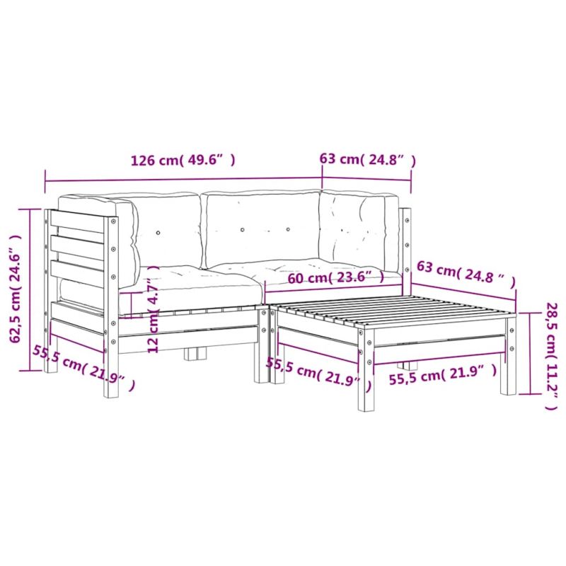 Това 2-местно дървено градинско кресло с възглавници и табуретка ще бъде страхотно допълнение към вашата градина, тераса или вътрешен двор за разговори със семейството и приятели или просто за наслаждаване на времето. Импрегнирана дървесина: Масивната борова дървесина е красив естествен материал. Боровата дървесина е с продълговати шарки, а чеповете придават на материала характерния му рустик вид. Импрегнирането е процес на запазване, който се извършва с помощта на автоклави. Обработката под налягане повишава устойчивостта на гниене и атмосферни влияния.Удобна седалка: Облегалката и подплатените възглавници правят градинския диван по-удобен за сядане.Разнообразна употреба: Тази външна табуретка за крака може да се използва не само за сядане или отпускане на краката ви, но може да се използва и като масичка за кафе, за да държите вашите напитки, храна и други декорации.Дизайн с ламели: Конструкцията с ламели на палетния диван ефективно предотвратява събирането на вода, като гарантира, че седалката ще остане суха и няма да изгние.Модулен дизайн: Дървеният градински диван има модулен дизайн, което го прави напълно гъвкав и лесен за преместване, за да пасне на всяка обстановка. Можете да комбинирате различни модулни елементи, налични в падащото меню, за да създадете собствени конфигурации на градинска зона за отдих! Добре е да се знае:За да сте сигурни, че вашите външни мебели ще останат красиви, ви препоръчваме да ги защитите с водоустойчиво покривало.
