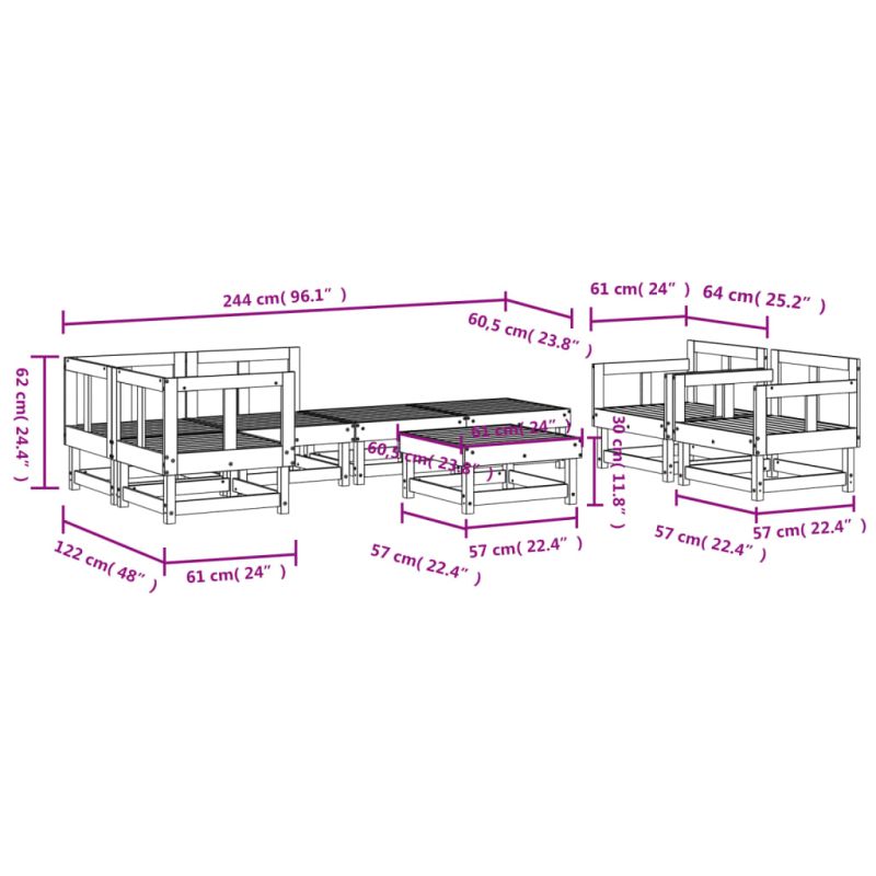 Този дървен градински лаундж комплект, който се откроява с дизайн на летви, ще бъде чудесно допълнение към вашата градина, вътрешен двор или тераса, за да се насладите на уютно време със семейството или приятелите си. Импрегнирана дървесина: Масивната борова дървесина е красив естествен материал. Боровата дървесина е с продълговати шарки, а чеповете придават на материала характерния му рустик вид. Импрегнирането е процес на запазване, който се извършва с помощта на автоклави. Обработката под налягане повишава устойчивостта на гниене и атмосферни влияния.Здрава и стабилна рамка: Дървените рамки правят лаундж комплекта здрав и стабилен за ежедневна употреба на открито.Модулен дизайн: Комплектът мебели е гъвкав и лесен за преместване. Можете да я комбинирате с други модулни сегменти в уеб магазина, за да създадете свои лични конфигурации на градински лаундж комплект! Добре е да се знае:За да сте сигурни, че вашите външни мебели ще останат красиви, ви препоръчваме да ги защитите с водоустойчиво покривало.Възглавниците не са включени в доставката. Максимално 110 кг на седалка.