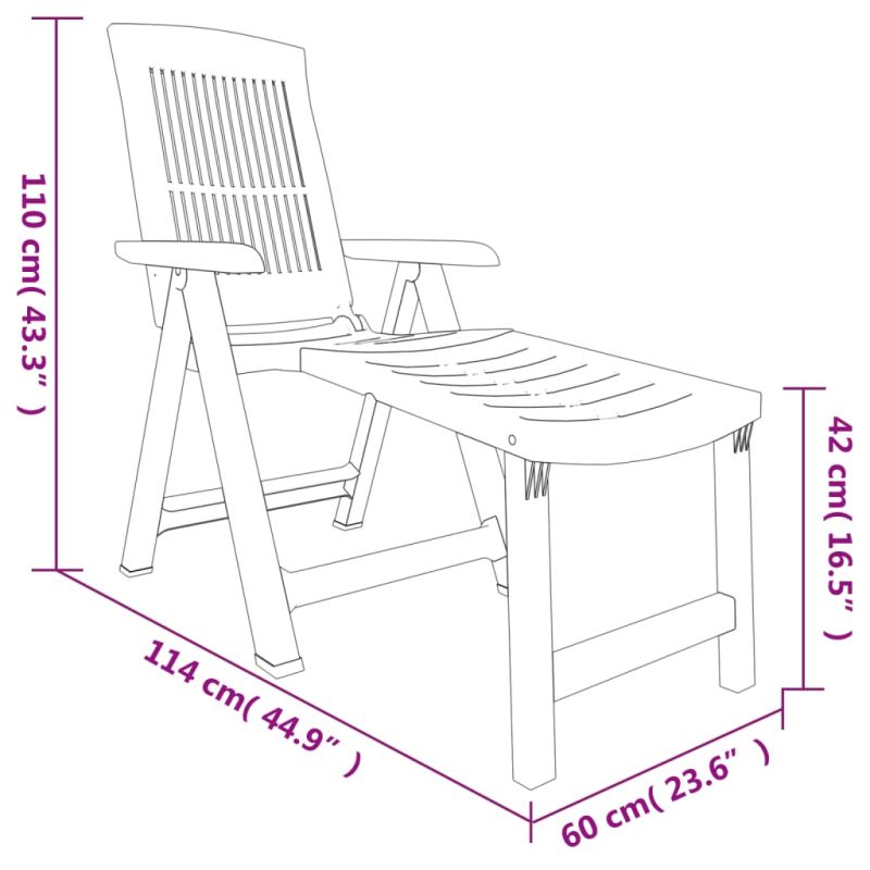 Отпуснете се и релаксирайте на този шезлонг в градината, на двора или на всяко друго място за отдих на открито! Издръжлив материал: Удобният шезлонг за открито е изработен от здрава и устойчива на атмосферни влияния пластмаса, която е подходяща за използване на открито.Сгъваема функция: Градинският шезлонг може да се сгъне, за да пести място, когато не се използва.Регулируема облегалка: Облегалката на шезлонга е наклоняема в 5 позиции, като можете да се насладите на максимален комфорт, избирайки оптималната позиция и ъгъл.Лесно местене: Благодарение на олекотения му дизайн можете лесно да местите шезлонга.Добре е да се знае:За да сте сигурни, че вашите външни мебели ще останат красиви, ви препоръчваме да ги защитите с водоустойчиво покривало.