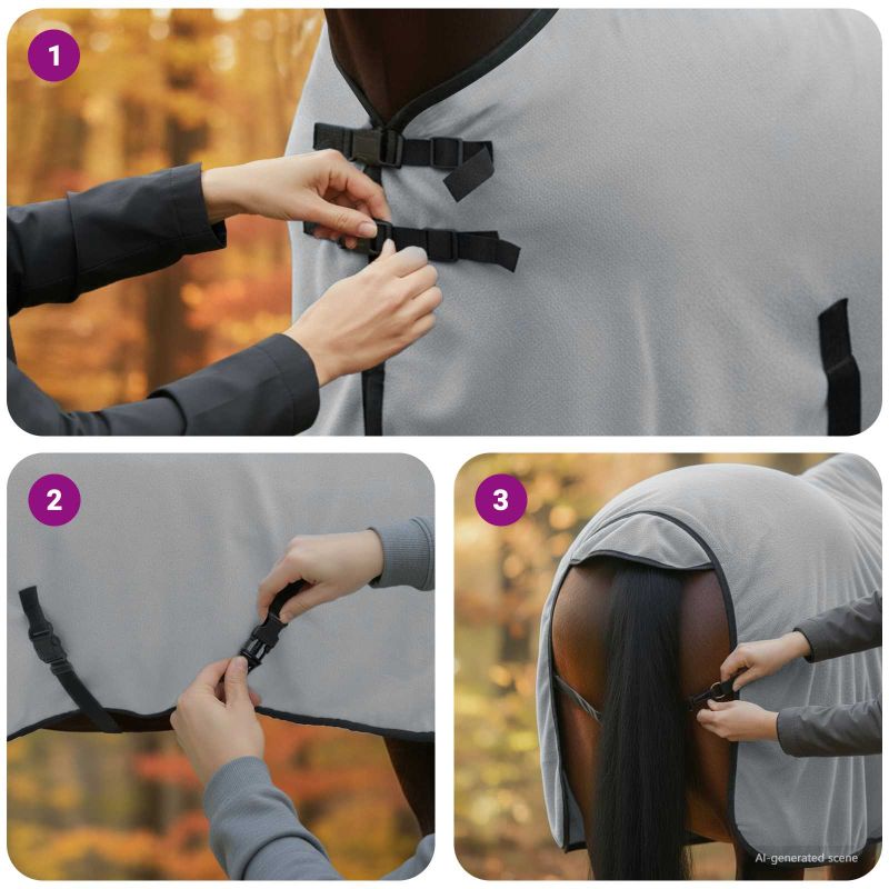 Това конско одеяло съчетава модерен стил с практичност, за да осигури на вашия кон топлина през зимата. Изработено е от здрав полиестер, с мека велурена текстура, която придава луксозен вид. С елегантен дизайн, този продукт е за външна употреба и предлага комфорт за коня сред природата без лишения. Плътното прилягане е идеално, за да държи коня уютен. Материал: Одеялото е от полиестер и предлага голяма издръжливост и устойчивост на неблагоприятни условия. Велурената текстура не само придава лукс, но и осигурява максимален комфорт и топлина без дразнене. Сменяем калъф: Лесно свалящият се калъф прави почистването изключително удобно. Просто свалете калъфа и го изперете на 30 градуса - идеално решение за поддръжка и хигиена. Регулиране: Одеялото е с разглобяеми части, което позволява настройка спрямо размера на коня. Осигурява отлично прилягане и защита от студен въздух. Зимна употреба: Специално проектирано за зимата, това одеяло помага на коня да остане топъл и осигурява нужната изолация. Лесна поддръжка: Поради периметъра, който е за пране и лесния разглобяем дизайн, поддържането на комфорт е просто и ефективно.