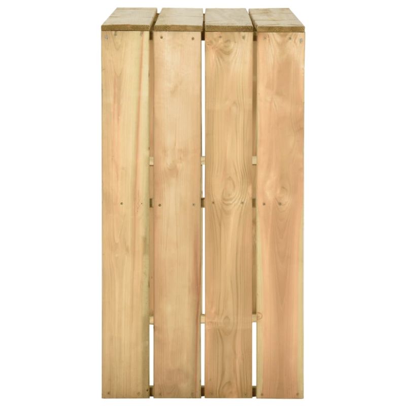 Тази дървена бар маса, отличаваща се с изчистен външен вид, е създадена да бъде отлично допълнение към външното ви пространство. Можете да поговорите или да похапнете нещо вкусно със семейството или приятелите си около тази красива дворна маса. Изработена е от импрегнирана борова дървесина, което я прави издръжлива и устойчива на корозия. Затова градинската трапезна маса е подходяща за употреба на открито. Елегантният дизайн на бар масата я превръща в неподвластен на времето аксесоар за градината ви. Освен това може да се използва и на закрито. Забележка: За да удължите живота на вашите градински мебели, ви препоръчваме да ги защитите с водоустойчиво покритие.