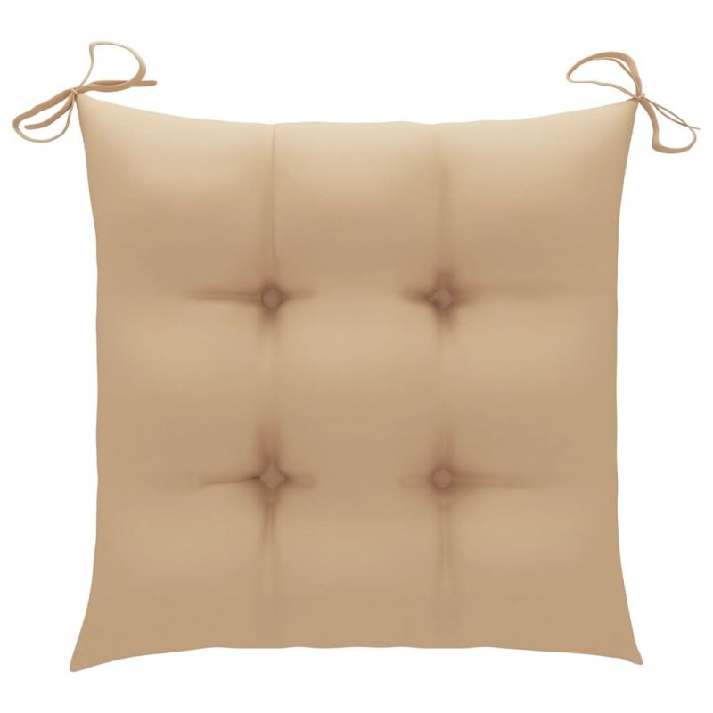 Добавете щрих на рустик чар към вашата трапезария, градина или вътрешен двор с този комплект стифиращи градински столове с възглавници! Този комплект трапезни столове ще извиси вашето вътрешно или външно жилищно пространство със своя елегантен ламелен дизайн. Комплектът мебели от тик е изработен от изключително издръжлива тикова твърда дървесина, която е суха – изсушена в пещ и фино шлифована, за да ѝ се придаде много гладък вид. Тиковото дърво е известно с изключителната си здравина и устойчивост на атмосферни влияния, което го прави далеч по-подходящо за градински мебели от всеки друг вид дърво. Тиковата дървесина е идеалният избор, ако искате да закупите дълготрайна градинска мебел. Лесно се поддържа и почиства с влажна кърпа. Освен това трапезните столове се подреждат един върху друг, за да се пести място за съхранение, когато не се използват. Нещо повече, включените възглавници осигуряват допълнителен комфорт. Всяка възглавница има 2 комплекта връзки, за да я фиксирате плътно към стола. Забележка: За да удължите живота на вашите градински мебели, препоръчваме ви да ги почиствате редовно и да не ги оставяте ненужно на открито без защита.Почистване: Използвайте мек сапунен разтворСъхранение: Ако е възможно, съхранявайте на хладно и сухо място на закрито. Ако продуктът се съхранява на открито, защитете го с водоустойчиво покривало. Избършете и изсушете излишната вода или сняг от плоските повърхности след дъжд или снеговалеж. Позволете достатъчно циркулация на въздуха, за да избегнете повреди, свързани с влагата.
