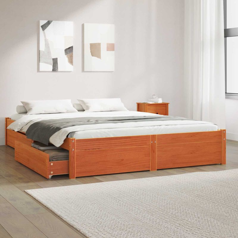 Това легло с място за съхранение е стилно решение за всяка модерна спалня, където простотата среща функционалността. Направено е от здрава масивна борова дървесина и предлага универсално легло с вградени чекмеджета, които помагат за подреждане на одеяла, дрехи и други вещи. Перфектно е за малки спални или за минимизиране на безредиците. Чистите линии и натуралният материал осигуряват лесно съвпадение с различни интерьорни стилове.,},{,id,Parent_DescriptionHighlights,Language,Bulgarian,Translation[,{,К , П Г , О , По , , , c , Т А ,,, , Конструкция от масивна борова дървесина Рамката е здраво направена от бор, което ѝ осигурява дълготрайност и стил. Естественият ѝ завършек подчертава декора и гарантира стабилност дълго време. Масивните ламели предлагат превъзходна подкрепа за матрака и добавят комфорт на съня. Вградени плъзгащи чекмеджета Оборудвани с леки ролки, чекмеджетата предлагат удобно съхранение на спално бельо или сезонни дрехи, така че да поддържате стаята подредена и без безпорядък. Този иновативен дизайн се вписва прекрасно в минималистичната естетика на леглото. Гъвкава съвременна естетика Проектирана да се интегрира безпроблемно, рамката носи във всяка стая стил, а елегантният ѝ силует добавя нотка на изтънченост. Простата ѝ форма е перфектна за различен цвят и стил на интериора — от класически до модерен. Само за вътрешна употреба Рамката е проектирана специално за вътрешни пространства и добавя функционалност и естетика в спалнята, съчетавайки ги, за да стане център на вниманието в стаята. Лесна поддръжка Обслужването ѝ е простичко — само трябва да я избършете с кърпа, за да изглежда винаги добре. Тази лесна поддръжка запазва рамката в отлично състояние без усилия и помага тя да остане ценна част от вашето обзавеждане дълго време.