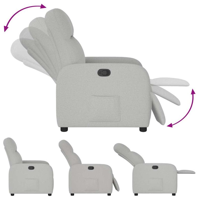 Облегнете се и се отпуснете в този изключително комфортен наклоняем стол! Функция за ръчно накланяне: Този накланящ се стол има дръжка от дясната страна. Можете ръчно да настроите поставката за крака и облегалката до произволна позиция според вашето удобство с просто издърпване на дръжката. Тази функция позволява максимален наклон от 135 градуса. Освен това облегалката може бързо да се върне на първоначалното си място с лесно издърпване на дръжката.Удобно седене: Дебело подплатената седалка, облегалката и широките подлакътници, покрити с текстил, осигуряват уютно и топло усещане, което ви кара да се чувствате като в прегръдка, докато седите. Тъканта се отличава със семпъл и изчистен вид и е дишаща и издръжлива.Удобен страничен джоб: Този фотьойл има страничен джоб, за да държите основните си вещи леснодостъпни.Здрава и стабилна рамка: Рамката, изработена от дърво и метал, осигурява здрава структура и стабилност. Този накланящ се фотьойл е удобен и издръжлив.