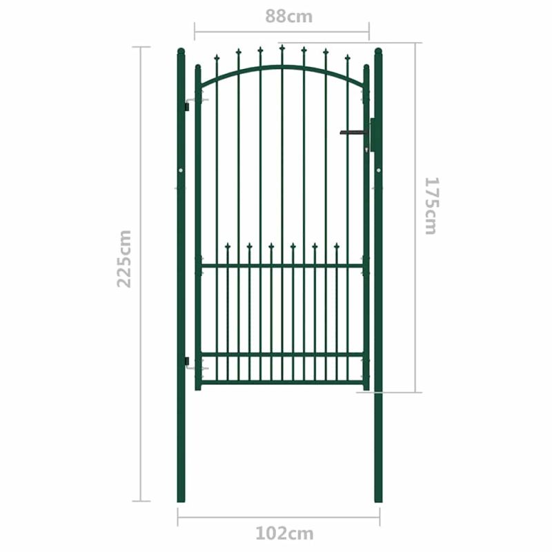 Тази оградна порта формира практична защитна преграда за вашата градина, вътрешен двор или тераса. Произведена от устойчива стомана, оградната порта има здрава конструкция и е прахово боядисана срещу ръжда и корозия. С вертикалните пръти с шипове и стабилната хоризонтална скоба като армировка тази градинска порта осигурява висока степен на сигурност. Дъгообразният дизайн на горната част допринася за нейната елегантност. Предлага се с два солидни пръта и здрави панти за лесен монтаж, а в доставката е включена и заключваща система с три ключа.
