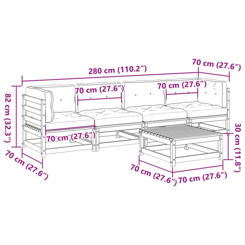 Този градински диван е идеалното допълнение към вашия заден двор, тераса или вътрешен двор, осигурявайки удобно и привлекателно пространство за разговори със семейството и приятелите или просто за почивка и забавление на открито. Здрав и издръжлив материал: Масивната борова дървесина е известна със своята здравина и издръжливост. Нейните прави зърна и отличителни възли допринасят за рустик чара ѝ. Тя е импрегнирана с консервиращ разтвор и е подложена на автоклавно третиране, което повишава устойчивостта ѝ на гниене и атмосферни влияния. Удобна седалка: Тази мебел за открито, снабдена с плътно подплатени възглавници, предлага удобство при сядане. Добро проветряване и предотвратяване на образуването на натрупвания: Дизайнът на ламелите спомага за оптимален въздушен поток и ефективно предотвратява събирането на вода, като осигурява суха и удобна седалка. Модулен дизайн: Този комплект външни мебели има модулен дизайн, което го прави напълно гъвкав и лесен за преместване, така че можете да създадете персонализирана подредба на външни мебели. Добре е да се знае:За да сте сигурни, че вашите външни мебели ще останат красиви, ви препоръчваме да ги защитите с водоустойчиво покривало. Максимално 110 кг на седалка. Съобразете се с риска от открит огън и други източници на силна топлина в близост до продукта.