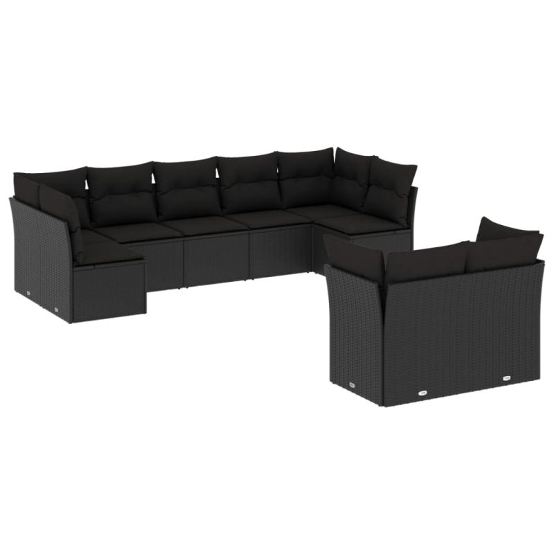 Градински комплект диван с възглавници 9 части черен полиратан