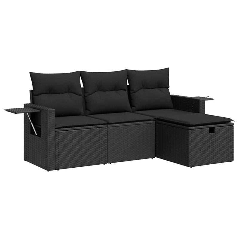 Градински диван от 4 части с възглавници, черен, полиратан