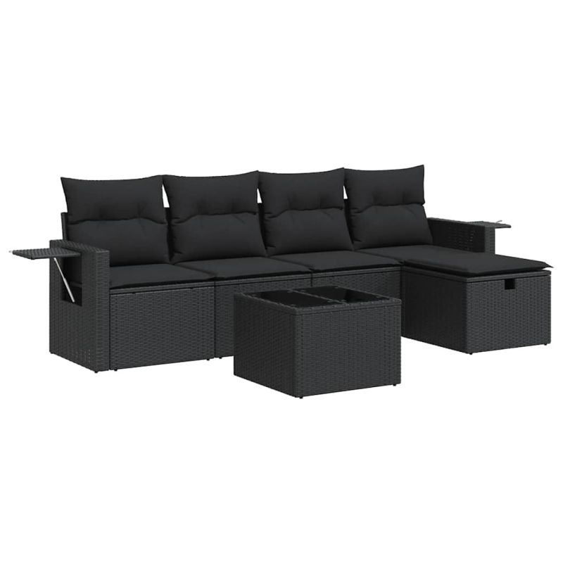 Градински диван с възглавници, 6 части, черен, полиратан