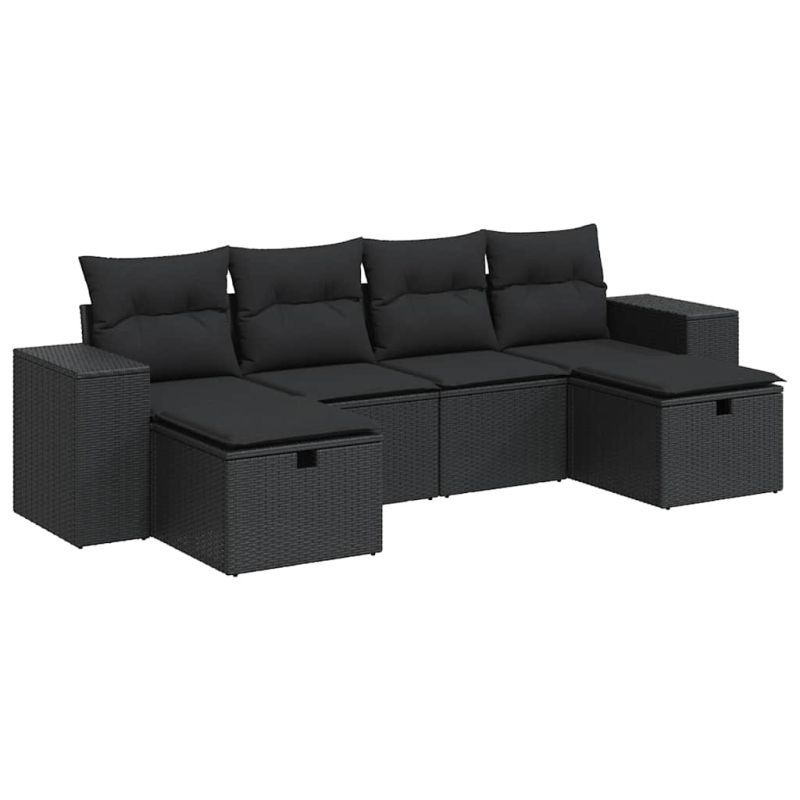 Градински диван с възглавници, 6 части, черен, полиратан