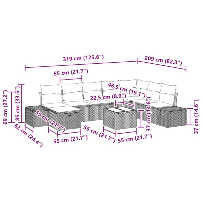 Градински Софа Комплект с възглавница 9 pcs Черно полиратан