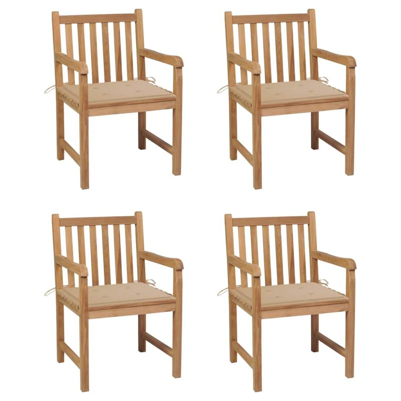 Градински столове, 4 бр, бежови възглавници, тиково дърво масив