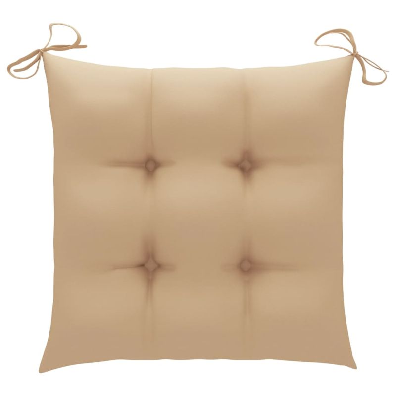Със своя рустик и практичен дизайн този комплект дървени градински столове ще добави нещо ново на вашето външно жилищно пространство! Тази мебел от тик е изработена от изключително издръжлива тикова твърда дървесина, която е суха – изсушена в пещ, а след това фино шлифована, за да ѝ се придаде много гладък вид. Тиковото дърво е известно с изключителната си здравина и устойчивост на атмосферни влияния, което го прави далеч по-подходящо за градински мебели от всеки друг вид дърво. Тиковата дървесина е идеалният избор, ако искате да закупите дълготрайна градинска мебел. Градинските столове се отличават с изискан вид, който ще пасне идеално на всяка градина или вътрешен двор. Комплектът е и идеалният избор за отморяващи моменти в романтична провинциална градина или близо до идилично градинско езерце. Включената възглавница е практична и декоративна функция. Забележка: За да удължите живота на вашите градински мебели, препоръчваме ви да ги почиствате редовно и да не ги оставяте ненужно на открито без защита.Почистване: Използвайте мек сапунен разтворСъхранение: Ако е възможно, съхранявайте на хладно и сухо място на закрито. Ако продуктът се съхранява на открито, защитете го с водоустойчиво покривало. Избършете и изсушете излишната вода или сняг от плоските повърхности след дъжд или снеговалеж. Осигурете достатъчно циркулация на въздух, за да избегнете повреди, свързани с влагата.
