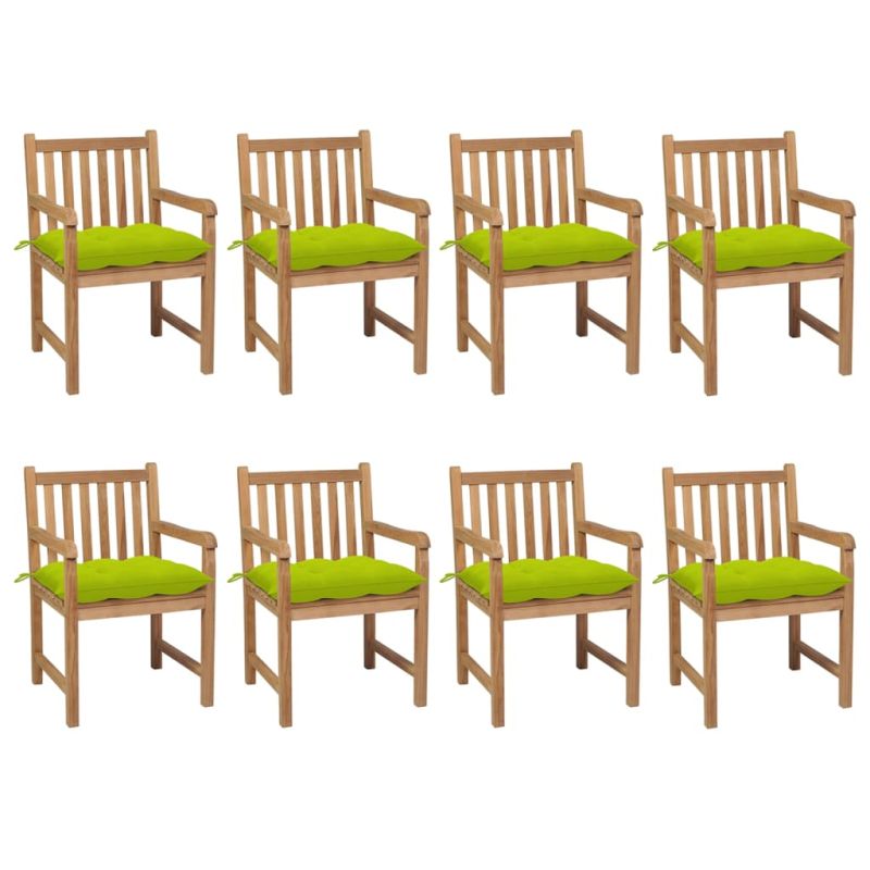 Градински столове, 8 бр, с яркозелени възглавници, тик масив