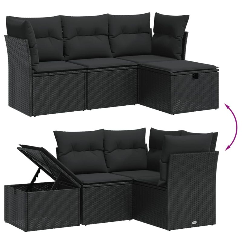 Градински диван от 4 части с възглавници, черен, полиратан