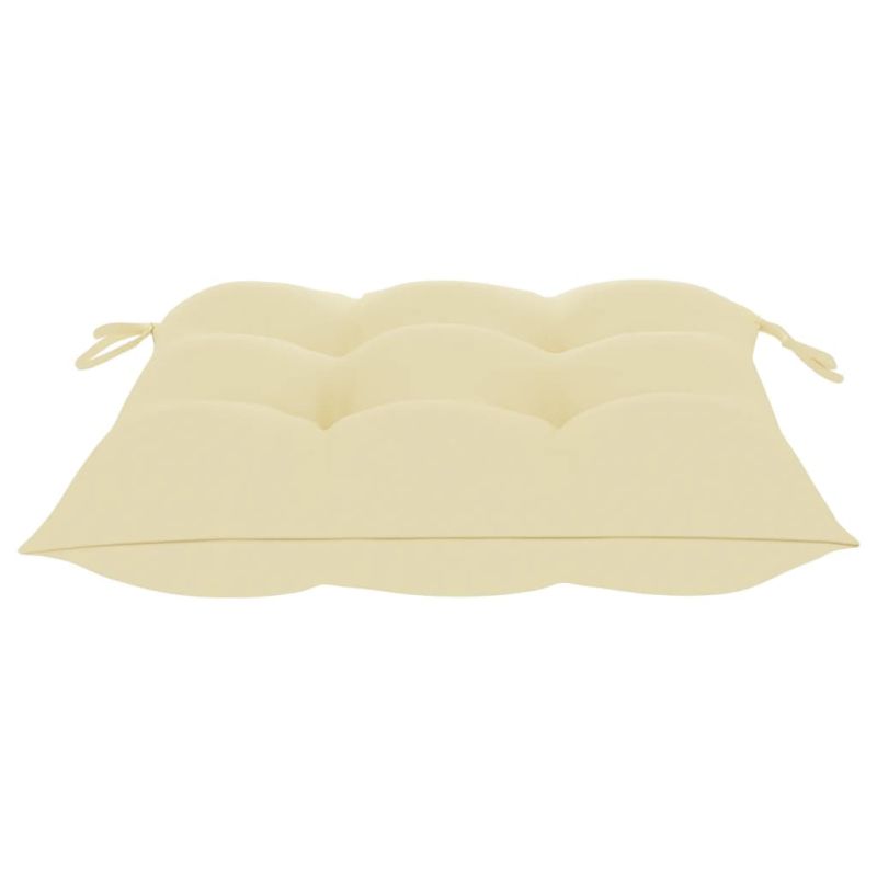 Добавете щрих на рустик чар към вашата трапезария, градина или вътрешен двор с този комплект стифиращи градински столове с възглавници! Този комплект трапезни столове ще извиси вашето вътрешно или външно жилищно пространство със своя елегантен ламелен дизайн. Комплектът мебели от тик е изработен от изключително издръжлива тикова твърда дървесина, която е суха – изсушена в пещ и фино шлифована, за да ѝ се придаде много гладък вид. Тиковото дърво е известно с изключителната си здравина и устойчивост на атмосферни влияния, което го прави далеч по-подходящо за градински мебели от всеки друг вид дърво. Тиковата дървесина е идеалният избор, ако искате да закупите дълготрайна градинска мебел. Лесно се поддържа и почиства с влажна кърпа. Освен това трапезните столове се подреждат един върху друг, за да се пести място за съхранение, когато не се използват. Нещо повече, включените възглавници осигуряват допълнителен комфорт. Всяка възглавница има 2 комплекта връзки, за да я фиксирате плътно към стола. Забележка: За да удължите живота на вашите градински мебели, препоръчваме ви да ги почиствате редовно и да не ги оставяте ненужно на открито без защита.Почистване: Използвайте мек сапунен разтворСъхранение: Ако е възможно, съхранявайте на хладно и сухо място на закрито. Ако продуктът се съхранява на открито, защитете го с водоустойчиво покривало. Избършете и изсушете излишната вода или сняг от плоските повърхности след дъжд или снеговалеж. Позволете достатъчно циркулация на въздуха, за да избегнете повреди, свързани с влагата. Максимално 110 кг на седалка.