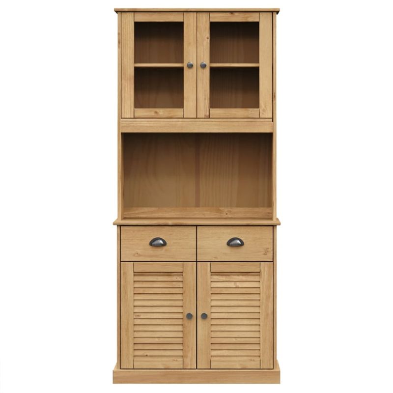 Търсите стилен висок шкаф? Този висок шкаф добавя елегантен чар към вашия интериор! Масивна борова дървесина: Масивната борова дървесина е красив естествен материал. Боровата дървесина е с продълговати шарки, а чеповете придават на материала характерния му рустик вид. Изработен от масивна борова дървесина, бюфетът е издръжлив и здрав.Достатъчно място за съхранение: Шкафът има чекмеджета и отделения, осигуряващи достатъчно място за поддържане на вашата колекция от чаши, чинии и малки декоративни предмети в добър ред.Стъклени врати: Вратите на този дървен шкаф витрина са с повишена здравина и безопасност благодарение на закаленото си полирано стъкло. При това позволява да виждате във вътрешността на горната половина, така че да разположите предметите красиво.Лесен за поддръжка: Шкафът бюфет се почиства лесно с влажна кърпа и изисква по-малко поддръжка.Метални дръжки: Високият шкаф се доставя с метални дръжки, които улесняват отварянето и затварянето на шкафа, като същевременно добавят допълнителна красота. Внимание:За предотвратяване на преобръщане този продукт трябва да се използва с предоставения анкер за стена.