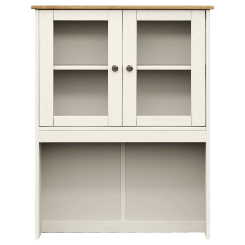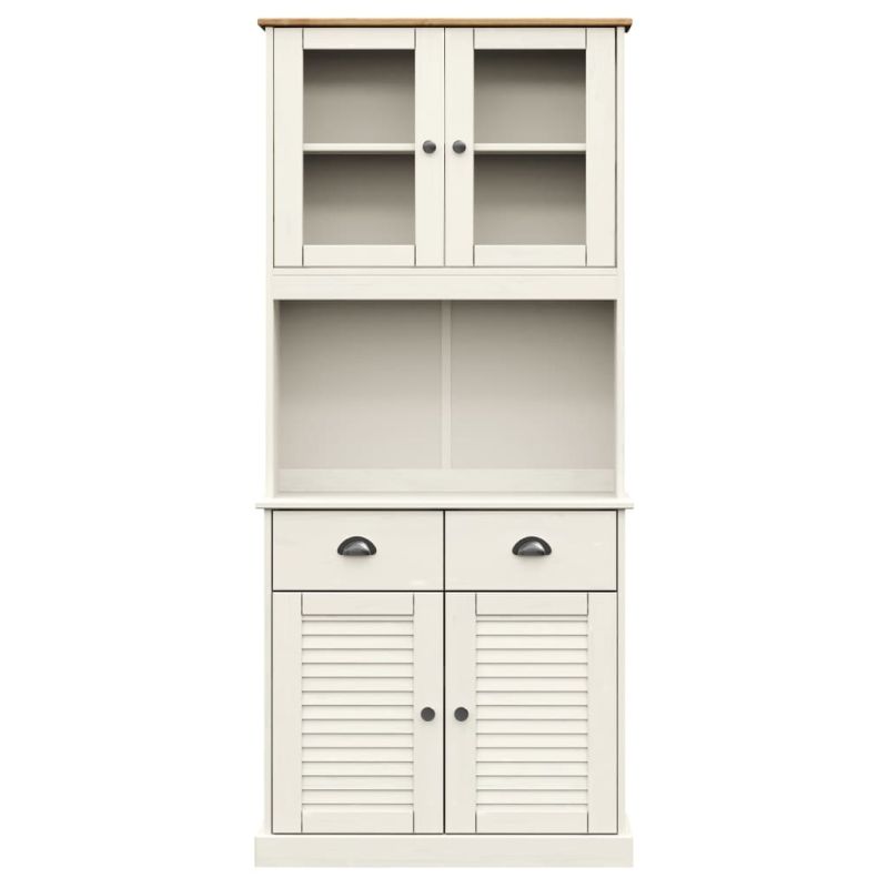 Търсите стилен висок шкаф? Този висок шкаф добавя елегантен чар към вашия интериор! Масивна борова дървесина: Масивната борова дървесина е красив естествен материал. Боровата дървесина е с продълговати шарки, а чеповете придават на материала характерния му рустик вид. Изработен от масивна борова дървесина, бюфетът е издръжлив и здрав.Достатъчно място за съхранение: Шкафът има чекмеджета и отделения, осигуряващи достатъчно място за поддържане на вашата колекция от чаши, чинии и малки декоративни предмети в добър ред.Стъклени врати: Вратите на този дървен шкаф витрина са с повишена здравина и безопасност благодарение на закаленото си полирано стъкло. При това позволява да виждате във вътрешността на горната половина, така че да разположите предметите красиво.Лесен за поддръжка: Шкафът бюфет се почиства лесно с влажна кърпа и изисква по-малко поддръжка.Метални дръжки: Високият шкаф се доставя с метални дръжки, които улесняват отварянето и затварянето на шкафа, като същевременно добавят допълнителна красота. Внимание:За предотвратяване на преобръщане този продукт трябва да се използва с предоставения анкер за стена.