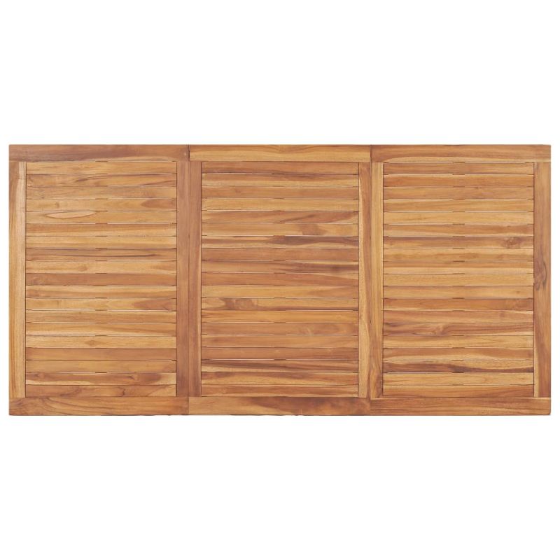 Този дървен градински трапезен комплект добавя нотка естествен чар към вашата кухня, градина или вътрешен двор. Тази мебел от тик е изработена от изключително издръжлива тикова твърда дървесина, която е суха – изсушена в пещ, а след това фино шлифована, за да ѝ се придаде много гладък вид. Тиковото дърво е известно с изключителната си здравина и устойчивост на атмосферни влияния, което го прави далеч по-подходящо за градински мебели от всеки друг вид дърво. Тиковата дървесина е идеалният избор, ако искате да закупите дълготрайна градинска мебел. Нанесен е красив финиш на водна основа за придаване на топъл цвят на дървото. Благодарение на изключително дебелия плот и големите крака тази маса от масивно дърво е много издръжлива и може да предостави удобство при настаняването на вашите гости. Столовете се отличават с изискана визия, която може незабавно да се слее с всяко жилищно пространство. Благодарение на водоустойчивата си функция и класическия си външен вид можете да поставите този комплект мебели навсякъде във вашия любим дом – на закрито или навън! Максимално 110 кг на седалка.