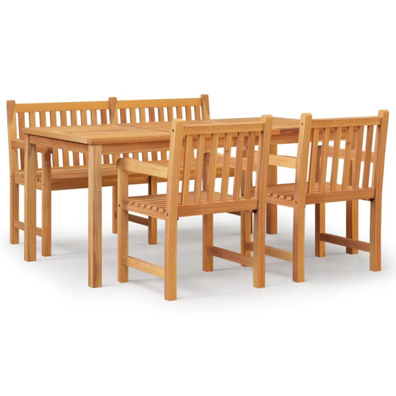 Този дървен градински трапезен комплект с елегантен и съвременен дизайн е чудесен избор за хранене или почивка в градината. Масивна тикова дървесина: Масивната тикова дървесина е красив естествен материал. Тя е обветрена, изсушена в пещ и след това фино шлифована, за да ѝ се придаде много гладък вид. Тиковото дърво е известно със своята изключителна здравина и устойчивост на атмосферни влияния.Здрав плот: Тази трапезна маса ви осигурява стабилен плот. Можете да поставите вашите закуски, напитки и всякакви любими декорации.Водоустойчива функция: Благодарение на водоустойчивата си функция и класическата си визия можете да поставите комплекта градински мебели навсякъде из дома си, както на закрито, така и на открито!Удобно седене: Всяка пейка и трапезен стол имат облегалка и подлакътници, което ги прави изключително удобни за сядане. Забележка:Всеки продукт се доставя с ръководство за сглобяване в кашона за лесно сглобяване.Забележка: За да удължите живота на вашите градински мебели, ви препоръчваме да ги защитите с водоустойчиво покривало. Максимално 110 кг на седалка.