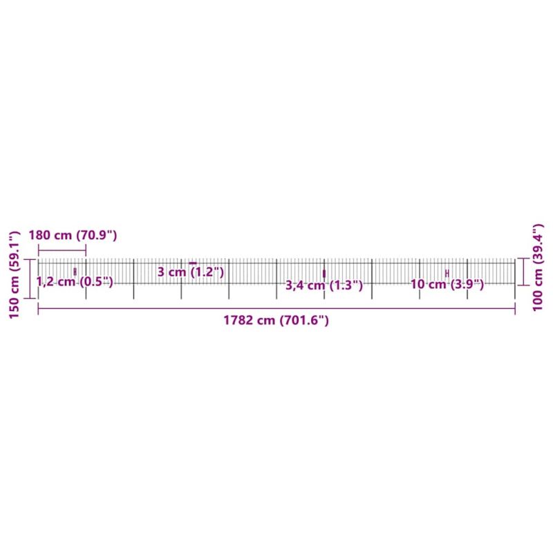 Създайте елегантна преграда около вашата градина, дом или алея с нашата градинска ограда! Нашата декоративна стоманена градинска ограда, състояща се от 10 градински панела и 11 стълба, има обща дължина от 17 метра. Тя ще формира здрава, сигурна и неизискваща поддръжка периметърна бариера за вашата градина, дом или бизнес имот. С вертикални колове със заострени върхове и здрава хоризонтална скоба за подсилване на рамката, нашата градинска ограда ще осигури висока степен на сигурност. Изработена от прахово боядисана устойчива стомана, градинската ограда е много здрава, стабилна и издръжлива. Благодарение на включените монтажни материали, градинската ограда се сглобява лесно. Забележка: Можете да закупите повече комплекти, за да направите оградата толкова дълга, колкото желаете.