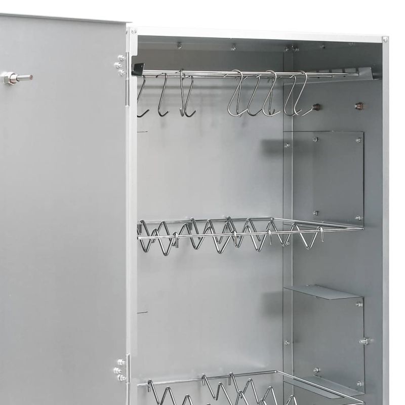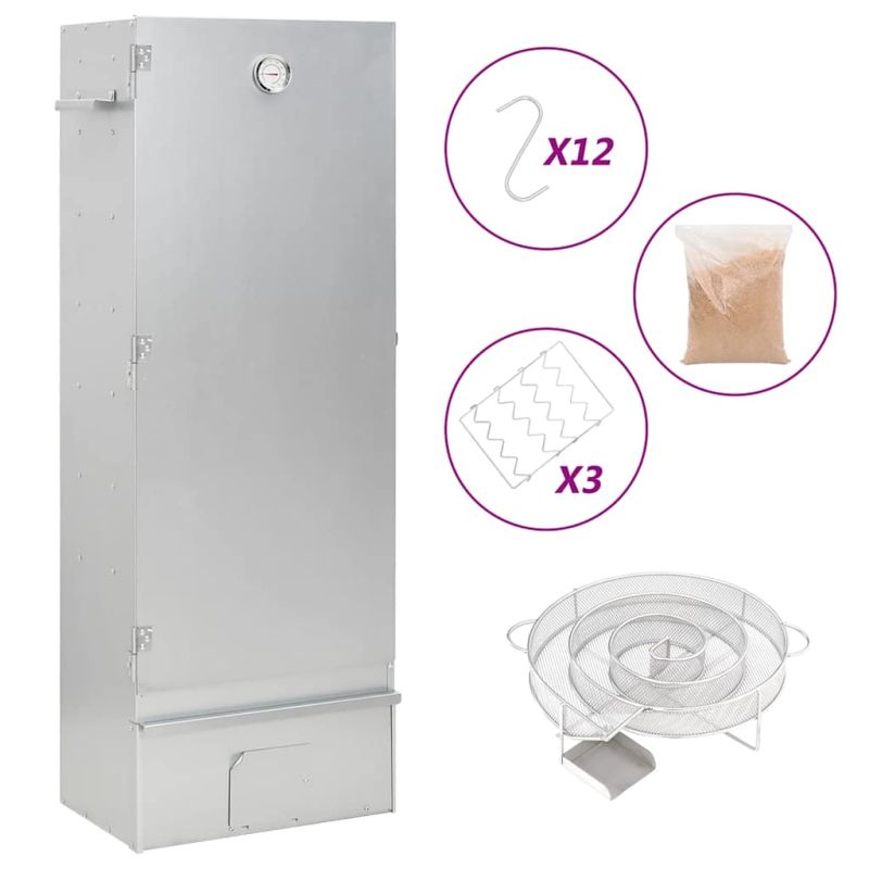 Използвайте тази многофункционална фурна опушвач с дървесни стърготини и генератор за студено пушене, за да приготвите угощение и да се насладите на уютно време на открито със семейството си! Издръжлив материал: Стоманата е изключително твърд и здрав материал. Тя предлага здравина и стабилност. Поцинковането осигурява по-добра защита срещу ръжда и е полезно за продукти, които ще се използват на открито.Достатъчно пространство за опушване: Външният опушвач осигурява много място за опушване на вашето месо, риба, колбаси и т.н. Включените S-образни куки и решетки правят вашето барбекю по-удобно.Индикативна функция: Димогенераторът е снабден с термометър за осигуряване на най-доброто изпичане.Генератор за студено пушене: Просто напълнете с дървени стърготини и запалете с чаена свещ, докато дървените стърготини започнат да променят цвета си. Отстранете малката лампа и поставете генератора за пушене в шкафа за студено опушване. Компактната мрежа с форма на охлюв позволява стружките за опушване да горят равномерно и бавно до 7 часа. Внимание:Не използвайте барбекюто в затворено и/или обитаемо пространство, напр къщи, палатки, каравани, кемпери, лодки. Опасност от фатален изход от отравяне с въглероден окис. Дръжте децата и домашните любимци далеч от димогенератора, когато работи. Не го използвайте на закрито. Не използвайте барбекюто в тесни или обитаеми пространства, например къщи, палатки, каравани, кемпери, лодки. Опасност от фатално натравяне с въглероден оксид. ВНИМАНИЕ: Не използвайте спирт или бензин за запалване или припалване! ПРЕДУПРЕЖДЕНИЕ! Не използвайте на закрито! ПРЕДУПРЕЖДЕНИЕ! Това барбекю става много горещо. Не го премествайте по време на работа. Дръжте децата и домашните любимци настрана. GPSR
