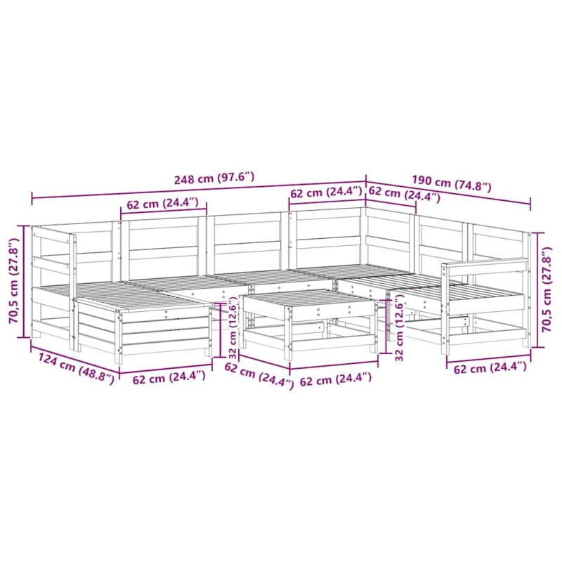 Този дървен градински лаундж комплект с летвен дизайн ще бъде чудесно допълнение към вашата градина, вътрешен двор или тераса, за да се насладите на уютно време със семейството или приятелите си. Здрав и издръжлив материал: Масивната борова дървесина е известна със своята здравина и издръжливост. Нейните прави зърна и отличителни възли допринасят за рустик чара ѝ. Тя е импрегнирана с консервиращ разтвор и е подложена на автоклавно третиране, което повишава устойчивостта ѝ на гниене и атмосферни влияния. Добро проветряване и предотвратяване на образуването на натрупвания: Дизайнът на ламелите спомага за оптимален въздушен поток и ефективно предотвратява събирането на вода, като осигурява суха и удобна седалка. Разнообразна употреба: Градинската табуретка за крака може да се използва не само за сядане или отпускане на краката ви, но може да се използва и като масичка за кафе, за да държите вашите напитки, храна и други декорации. Удобна странична масичка: Тази външна мебел разполага със сгъваема странична масичка с газова пружина на подлакътника, осигуряваща удобно място, за да държите най-важните неща леснодостъпни. Модулен дизайн: Този комплект външни мебели има модулен дизайн, което го прави напълно гъвкав и лесен за преместване, така че можете да създадете персонализирана подредба на външни мебели. Добре е да се знае:За да сте сигурни, че вашите външни мебели ще останат красиви, ви препоръчваме да ги защитите с водоустойчиво покривало. Максимално 110 кг на седалка.
