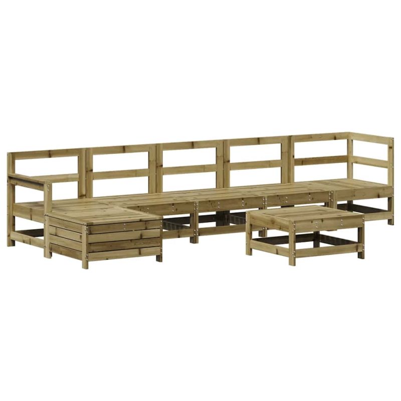 Този дървен градински лаундж комплект с летвен дизайн ще бъде чудесно допълнение към вашата градина, вътрешен двор или тераса, за да се насладите на уютно време със семейството или приятелите си. Импрегнирана дървесина: Масивната борова дървесина е красив естествен материал. Боровата дървесина е с продълговати шарки, а чеповете придават на материала характерния му рустик вид. Импрегнирането е процес на запазване, който се извършва с помощта на автоклави. Обработката под налягане повишава устойчивостта на гниене и атмосферни влияния.Здрава и стабилна рамка: Дървените рамки правят лаундж комплекта здрав и стабилен за ежедневна употреба на открито.Удобно седене: Облегалките и подлакътника добавят повече комфорт при седене на градинския комплект мебели. Универсална употреба: Външната отоманка с капак може да се използва не само за сядане или отпускане на краката, но и като масичка за кафе, на която да държите поставените напитки, храна, а градинската мебел разполага с място за съхранение под седалката. Модулен дизайн: Този комплект външни мебели има модулен дизайн, което го прави напълно гъвкав и лесен за преместване, така че можете да създадете персонализирана подредба на външни мебели. Добре е да се знае:За да сте сигурни, че вашите външни мебели ще останат красиви, ви препоръчваме да ги защитите с водоустойчиво покривало. Максимално 110 кг на седалка.