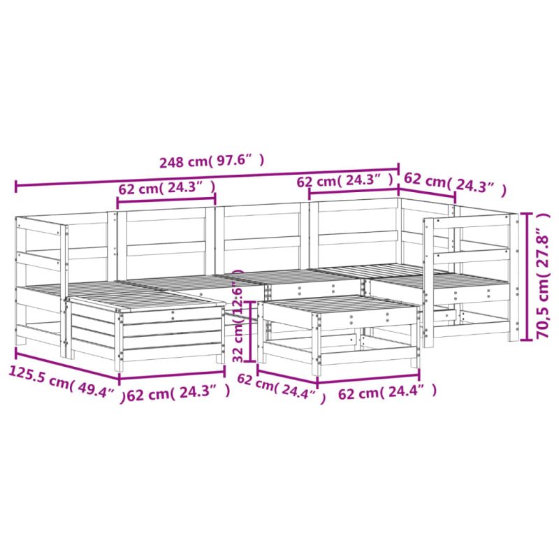 Този дървен градински лаундж комплект с летвен дизайн ще бъде чудесно допълнение към вашата градина, вътрешен двор или тераса, за да се насладите на уютно време със семейството или приятелите си. Здрав и издръжлив материал: Масивната борова дървесина е известна със своята здравина и издръжливост. Нейните прави зърна и отличителни възли допринасят за рустик чара ѝ. Тя е импрегнирана с консервиращ разтвор и е подложена на автоклавно третиране, което повишава устойчивостта ѝ на гниене и атмосферни влияния. Добро проветряване и предотвратяване на образуването на натрупвания: Дизайнът на ламелите спомага за оптимален въздушен поток и ефективно предотвратява събирането на вода, като осигурява суха и удобна седалка. Разнообразна употреба: Градинската табуретка за крака може да се използва не само за сядане или отпускане на краката ви, но може да се използва и като масичка за кафе, за да държите вашите напитки, храна и други декорации. Модулен дизайн: Този комплект външни мебели има модулен дизайн, което го прави напълно гъвкав и лесен за преместване, така че можете да създадете персонализирана подредба на външни мебели. Добре е да се знае:За да сте сигурни, че вашите външни мебели ще останат красиви, ви препоръчваме да ги защитите с водоустойчиво покривало. Максимално 110 кг на седалка.