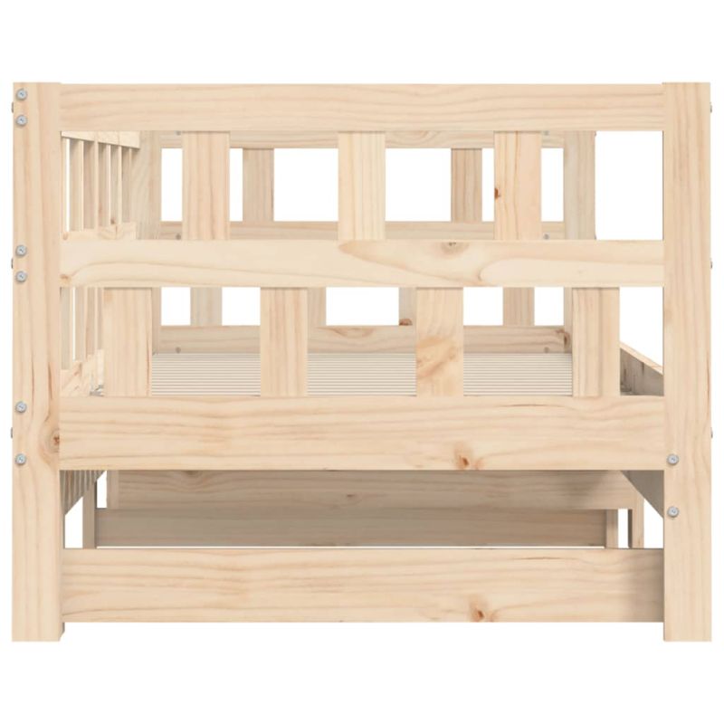 Това канапе 2-в-1 с изтеглящо разтегателно легло, което служи едновременно като диван и легло, е практично и атрактивно допълнение към вашата всекидневна или спалня. Масивна борова дървесина: Масивното борово дърво е красив естествен материал. Боровата дървесина е с продълговати шарки, а чеповете придават на материала характерния му рустик вид. Леглото за гости е изработено от масивна борова дървесина за стабилност и издръжливост.Функционална мебел: Канапето функционира като диван през деня и лесно се превръща в двойно легло през нощта чрез издърпване на механизма за изтеглящо разтегателно легло, осигурявайки удобно решение за настаняване на гости и увеличаване на пространството.Допълнително място за съхранение: Има допълнително пространство под леглото, което ви позволява да поставите чекмеджета или кутии за съхранение за вашите дрехи, чорапи, играчки, възглавници и др. Добре е да се знае:Доставката включва само рамка за дневно легло. Матракът не е включен. Можете да проверите в нашия магазин за подходящи матраци.
