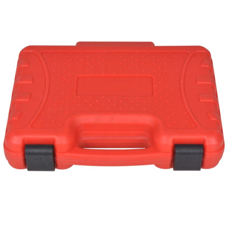 Този пълен комплект инструменти за занитване на вериги е задължителен за техниците, работещи с двигатели. Пресата за вериги позволява бързо, лесно и безопасно разделяне и сглобяване на вериги за зъбни колела. Този издръжлив комплект инструменти за занитване на вериги е изработен от здрава стомана. Комплектът е подходящ за двигатели, съвместими с гамата на Mercedes Benz, Chrysler и Jeep. Целият комплект се доставя в здраво куфарче.