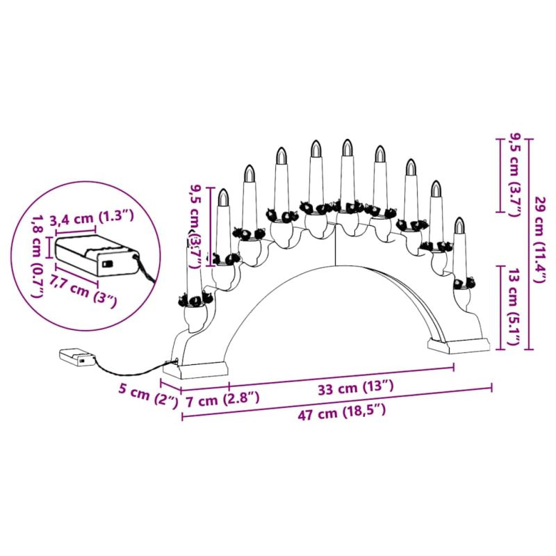 Коледната свещна арка с 10 LED свещи съчетава традиция и модерност за вълшебна празнична атмосфера. Изработена е от масивна борова дървесина и носи празничния дух, създавайки топла обстановка у дома. Проектирана да изглежда стилно на камини и первази на прозорци, арката свети с меко, топло бяло сияние, което е перфектно за семейни събирания и празнични тържества. Тази изискана декоративна част не само обогатява коледния уют, но също така предлага нотка носталгия по традиционния коледен декор. Масивна борова дървесина: Арката е от масивна борова дървесина, известна със своята здравина и красиви зърнести структури. Тази естествена композиция не само придава хубав вид на арката, но също така осигурява дълъг живот, правейки я вечен акцент в сезонния декор. Материалът осигурява топло, традиционно усещане, което идеално се вписва в празничната обстановка. Топло LED осветление: С 10 LED свещи, арката излъчва уютно топло бяло светло, перфектно за създаване на топла атмосфера. LED технологията предлага безопасно и енергийно ефективно осветление, което е идеално за целогодишна употреба. Наслади се на поканящото сияние, което преобразява пространството ти в празнично местенце. Безжично управление: Свещната арка работи с AA алкални батерии, което премахва нуждата от грозни кабели и контакти. Това безжично захранване прави арката универсална, позволявайки лесно разполагане в дома – от камини до маси – без да губи своя елегантен вид. Сезонно очарование: Проектирана с традиционни коледни мотиви, тази арка носи коледната магия в твоята всекидневна или трапезария. Нейният сложен дизайн и топлата светлина създават поканяща обстановка, идеална за празнични събирания, предоставяйки възможност за незабравими спомени по време на празниците. Минимална поддръжка: Дръж свещната арка в отлично състояние с лесна поддръжка. Изключвай батериите, когато не се използва и просто я избърсвай с суха кърпа, за да осигуриш дълготрайна употреба, така че арката да остава част от твоите сезонни декорации година след година. Предупреждение. Продуктът трябва да се използва само с батерии, отговарящи на спецификациите, посочени в ръководството.