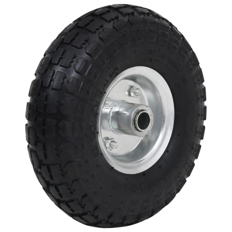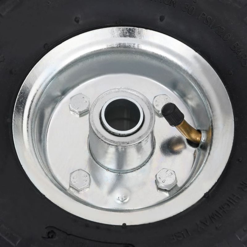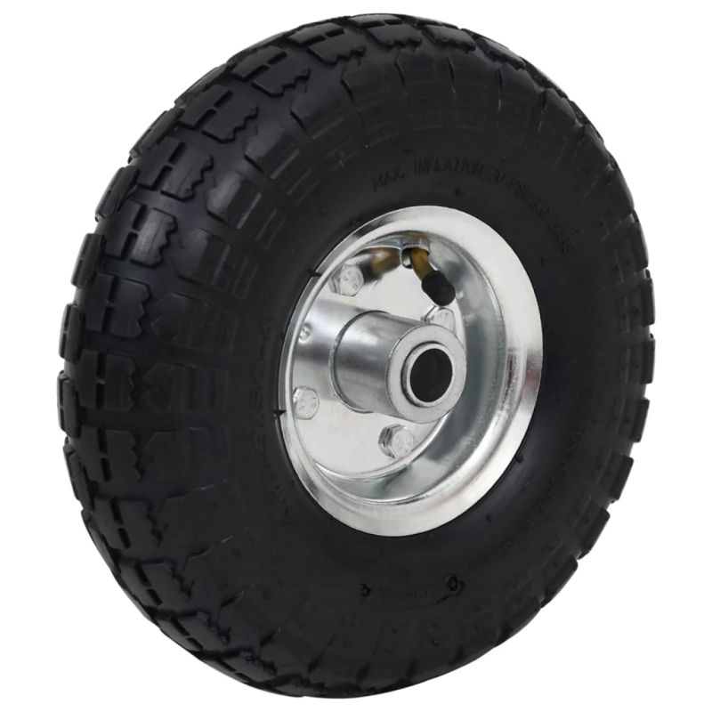 Тези устойчиви на пробиване резервни колела за транспортна количка са идеални за интензивна работа при преместване на товари с транспортни колички, товарни колички, колички за багаж, платформени колички, ръчни колички и др., дори и по груба настилка. Пневматичните гуми са изработени от здрава, устойчива на износване гума и имат специален дизайн на грайферите, който осигурява допълнително сцепление при по-високи скорости. Джантите са произведени от здрав метал. Колелата са с универсален размер и могат лесно да бъдат монтирани на вашите ръчни транспортни колички, багажни колички и др. Доставката включва 4 колела.