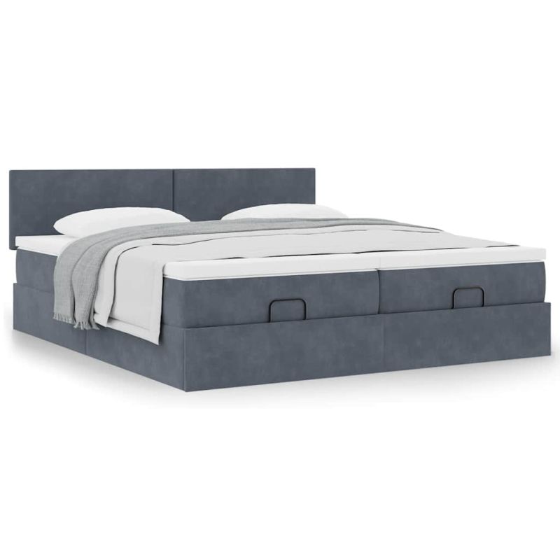 Използвайте това легло с матрак, за да се насладите на спокоен нощен сън! То ви предлага едновременно решение за съхранение и комфортен сън. Мек и удобен материал: Кадифената материя се отличава с мека и гладка повърхност, която създава приятно усещане върху кожата, като ви носи топлина и максимален комфорт.Матрак с джоб пружини: Този матрак с джоб пружини има индивидуални пружини с джобчета, които работят независимо, за да осигурят персонализирана опора, като реагират само на натиска във всяка област. Този дизайн предотвратява "свличането" към средата на матрака и намалява прехвърлянето на движение в сравнение с традиционните матраци с отворени намотки. Всяка покет пружина поддържа тялото индивидуално.Достатъчно място за съхранение под леглото: Благодарение на хидравличния повдигащ механизъм рамката на леглото предлага обширно пространство за съхранение под леглото, което увеличава пространството, без да заема допълнителна площ. Само с едно издърпване на дръжката основата на ламелите се повдига плавно, което ви позволява да прибирате вещите си бързо и без усилие.Удобен горен матрак: Този топ матрак подобрява опората и комфорта със своята мека, дишаща повърхност, като същевременно удължава живота на вашия матрак. Подвижният му калъф позволява лесно изпиране, което прави поддръжката лесна. Добре е да се знае:Това двойно легло се състои от две единични легла, като всяка ламелна основа може да се повдига самостоятелно.От хигиенни съображения матракът не може да бъде върнат, ако опаковката е отстранена или отворена.