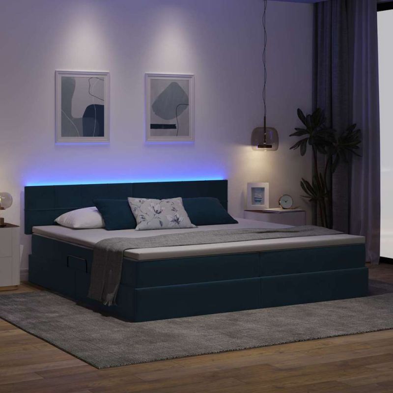 Легло с място за съхранение и LED Тъмен син 200 x 200 cm Кадифе
