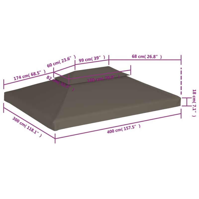 Насладете се на вашето външно жилищно пространство с нашия двоен покрив за шатри, независимо от слънцето или дъжда! Нашият резервен навес е изработен от устойчива полиестерна тъкан с PVC покритие, което го прави непромокаем. Покривът за беседка предпазва от палещото слънце, силния дъжд и други сурови метеорологични условия. За вашата безопасност обаче се уверете, че по покривалото не се натрупва вода. Този сенник има подсилени ъгли за повишена издръжливост. Предлагаме също и велкро ленти за лесен монтаж и закрепване към вашата шатра. Моля, обърнете внимание, че рамката за шатра не е включена в доставката.