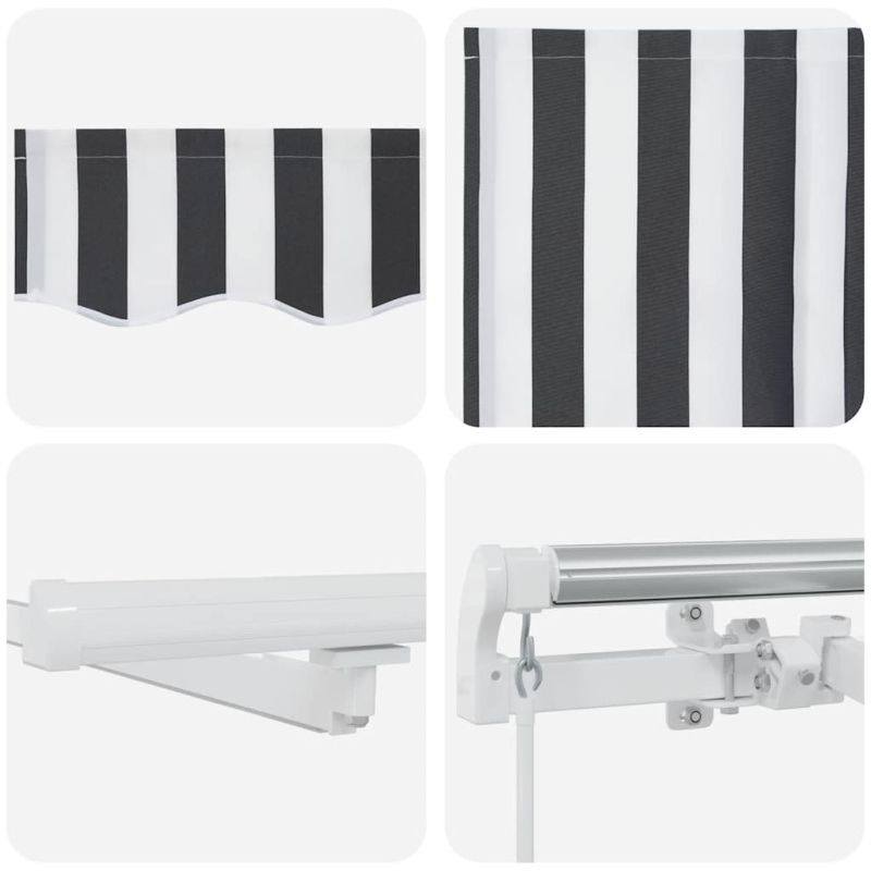Създайте хубаво и прохладно място във вашия двор и се предпазете от ултравиолетовите лъчи с тази прибираща се тента! Водоустойчива и устойчива на UV лъчи материя: Материята на тентата е изработена от полиестер с висока плътност и полиуретаново покритие, който е водоустойчив, устойчив на UV лъчи и избледняване.Лесен за работа: Ъгълът и височината могат да се регулират, за да отговорят на вашите различни нужди. Можете да отваряте и прибирате тентата плавно с дългата манивела.LED светлини: Интегрираните LED светлини на тентата осветяват вашето външно жилищно пространство и създават уютна и романтична атмосфера, когато слънцето залезе.Широки приложения: Разтегателната тента се отличава с прост, стилен дизайн, който ще се слее добре с вашия дом или търговски обекти. Подходящ е за различни места, като тераси, вътрешни дворове, ресторанти, кафенета, магазини и др. Инструкциите за експлоатация трябва да се прочетат преди монтирането и използването на продукта. Съхранявайте това ръководство за бъдещи справки. Този продукт е предназначен за използване на открито и в домашни условия само като слънцезащита или декорация. Никога не го използвайте за други цели и не модифицирайте продукта. Не го използвайте на места, където има вибрации, импулси или високи температури, като например стени в близост до печки. Винаги носете подходящи лични предпазни средства, когато монтирате и регулирате тентата. При работа на голяма височина съществува риск от падане, използвайте подходяща защита срещу падане. Бъдете внимателни по време на монтажа, възможно е да съществуват рискове от смачкване и срязване. НЕ премахвайте предпазните обвивки. Тези обвивки могат да бъдат отстранени само след като са завършени всички етапи на монтажа и всички болтове са закрепени, а изделието е прикрепено към стената. Прекалено ранното отстраняване на обвивките може да доведе до сериозни наранявания. Този продукт и неговите крепежни части са подходящи за монтаж само върху обикновена циментова стена или стабилна неизмазана тухлена зидария. Ако стената/тухлената зидария показва пукнатини, трябва да се консултирате с професионалист. Ако сградата ви има външна обвивка (като изолация, двойна тухлена стена или облицовка от тухли), монтажът трябва да се изнесе от професионалист. Никога не го монтирайте на високи и ветровити места, тъй като сенникът може да падне и да нарани хора. Не монтирайте тентата, когато са открити повредени или липсващи части. Външната щора трябва да се прибере, ако скоростта на вятъра е по-висока от 28 км/ч. Преди да отворите тентата, уверете се, че всички конзоли са монтирани здраво в стойките на стената и всички болтове са добре затегнати ВСИЧКИ ЗАТВАРЯТ тентата по време на силен или бурен вятър, дъжд и когато не се използва. Ако не го направите, това може да доведе до телесни наранявания и/или материални щети. Също така, Удължителните рамена са подложени на голямо напрежение и могат да причинят сериозни повреди или наранявания. Децата трябва да бъдат наблюдавани, за да се гарантира, че няма да си играят с уреда. Не използвайте уреда, ако е необходим ремонт или регулиране. Не използвайте тентата, когато в близост се извършва поддръжка, например почистване на прозорци. Работата при мразовити условия може да повреди тентата. Не поставяйте тежки неща върху рамката,