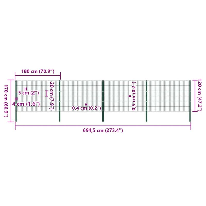 Ограден панел с железни стълбове, 694,5x120 см, зелен