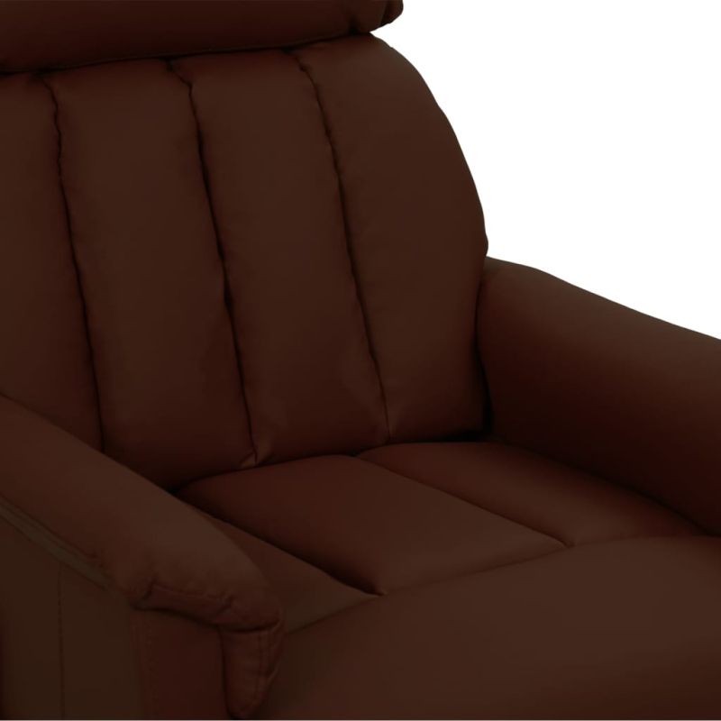 Облегнете се и се отпуснете в този изключително комфортен наклоняем стол! Функция за ръчно накланяне: Накланящият се стол е специално проектиран с 3 позиции на наклон, така че да можете да регулирате ръчно облегалката и поставката за крака според вашето удобство.Удобно седене: Дебело подплатената седалка, облегалката и широките подлакътници, покрити с изкуствена кожа, осигуряват уютно и топло усещане, което ви кара да се чувствате като в прегръдка, докато седите. Изкуствената кожа е много издръжлив материал. Устойчива е на петна, което я прави лесна за почистване с влажна кърпа. Гладката повърхност също така придава луксозен вид и красотата на истинската кожа.Здрава и стабилна рамка: Рамката, изработена от дърво и метал, осигурява здрава структура и стабилност. Този накланящ се фотьойл е удобен и издръжлив.