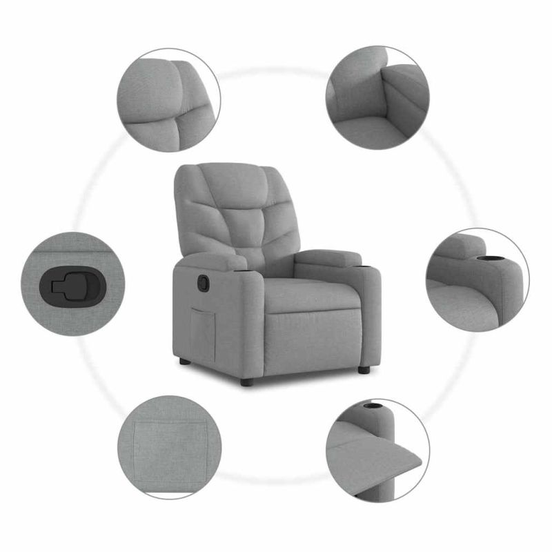 Облегнете се и се отпуснете в този изключително комфортен наклоняем стол! Функция за ръчно накланяне: Този накланящ се стол има дръжка от дясната страна. Можете ръчно да настроите поставката за крака и облегалката до произволна позиция според вашето удобство с просто издърпване на дръжката. Тази функция позволява максимален наклон от 135 градуса. Освен това облегалката може бързо да се върне на първоначалното си място с лесно издърпване на дръжката.Удобно седене: Дебело подплатената седалка, облегалката и широките подлакътници, покрити с текстил, осигуряват уютно и топло усещане, което ви кара да се чувствате като в прегръдка, докато седите. Тъканта се отличава със семпъл и изчистен вид и е дишаща и издръжлива.Удобни поставки за чаши и страничен джоб: Този фотьойл разполага с две удобни поставки за чаши за вашите напитки и страничен джоб, за да държите основните си вещи леснодостъпни.Здрава и стабилна рамка: Рамката, изработена от дърво и метал, осигурява здрава структура и стабилност. Този накланящ се фотьойл е удобен и издръжлив. Максимално 110 кг на седалка.