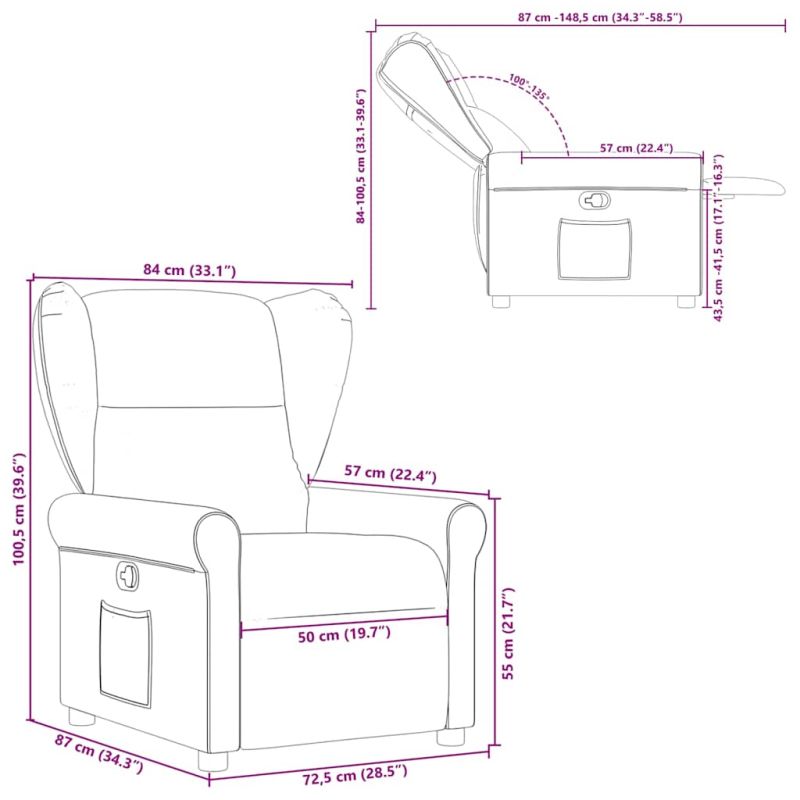 Облегнете се и се отпуснете в този изключително комфортен наклоняем стол! Функция за ръчно накланяне: Този накланящ се стол има дръжка от дясната страна. Можете ръчно да настроите поставката за крака и облегалката до произволна позиция според вашето удобство с просто издърпване на дръжката. Тази функция позволява максимален наклон от 135 градуса. Освен това облегалката може бързо да се върне на първоначалното си място с лесно издърпване на дръжката.Удобно седене: Дебело подплатената седалка, облегалката и широките подлакътници, покрити с текстил, осигуряват уютно и топло усещане, което ви кара да се чувствате като в прегръдка, докато седите. Тъканта се отличава със семпъл и изчистен вид и е дишаща и издръжлива.Удобен страничен джоб: Този фотьойл има страничен джоб, за да държите основните си вещи леснодостъпни.Здрава и стабилна рамка: Рамката, изработена от дърво и метал, осигурява здрава структура и стабилност. Този накланящ се фотьойл е удобен и издръжлив.