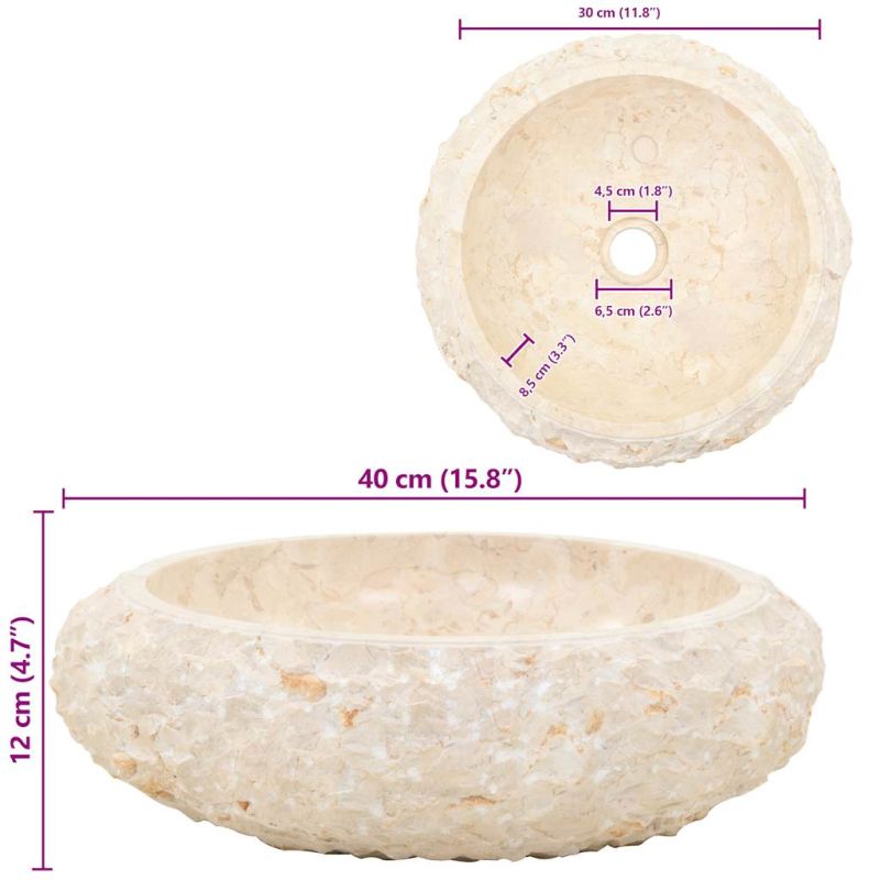 Тази мраморна мивка излъчва рустик чар и ще бъде истински акцент във вашата баня или тоалетна. Този удивителен умивалник представлява не само удобна за потребителя мивка за ежедневна употреба, но и украшение за вашето жилищно пространство. Изцяло ръчно изработен от елегантен мрамор, умивалникът е изключително здрав и в същото време изискан. Той със сигурност ще подхожда на всеки интериорен стил. Освен това мивката се почиства много лесно. Забележка: Мраморът е естествен продукт и поради това може да съществуват нюанси в цвета. Истинският продукт може да е по-светъл или по-тъмен, отколкото на снимките, а понякога да съдържа комбинация от цветове.