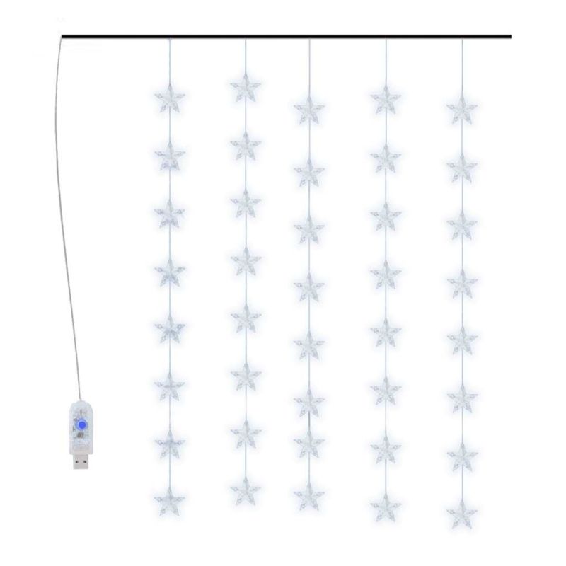 Тази LED завеса от светещи звезди е идеална за употреба като допълнително осветление към всякакви проекти за украса. Подходяща е за Коледа, партита, сватби и други празници. Светещата завеса е снабдена с 200 енергоспестяващи светодиода, създаващи вълшебно осветление. Те имат 8 различни светлинни ефекта: комбинирано, вълни, последователно, бавно светене, мигане, бавно избледняване, блещукане и непрекъснато светене. Той е чудесен декоративен аксесоар за осветяване на вътрешни и външни пространства. Забележка: Включеното USB не е водоустойчиво, така че тази част трябва да избягва водата, но благодарение на 3-метровия кабел коледната украса може да се използва на открито, тъй като кабелът и продуктът са водоустойчиви. Продуктът има USB конектор, но не е включен сертифициран източник на захранване от 5V USB. Този продукт се захранва с DC 5V, но сертифицираният 5V USB източник на захранване не е включен в комплекта. По-високото напрежение може да доведе до прегряване на устройството и да доведе до повреда на устройството и потенциален риск от прегряване и пожар.