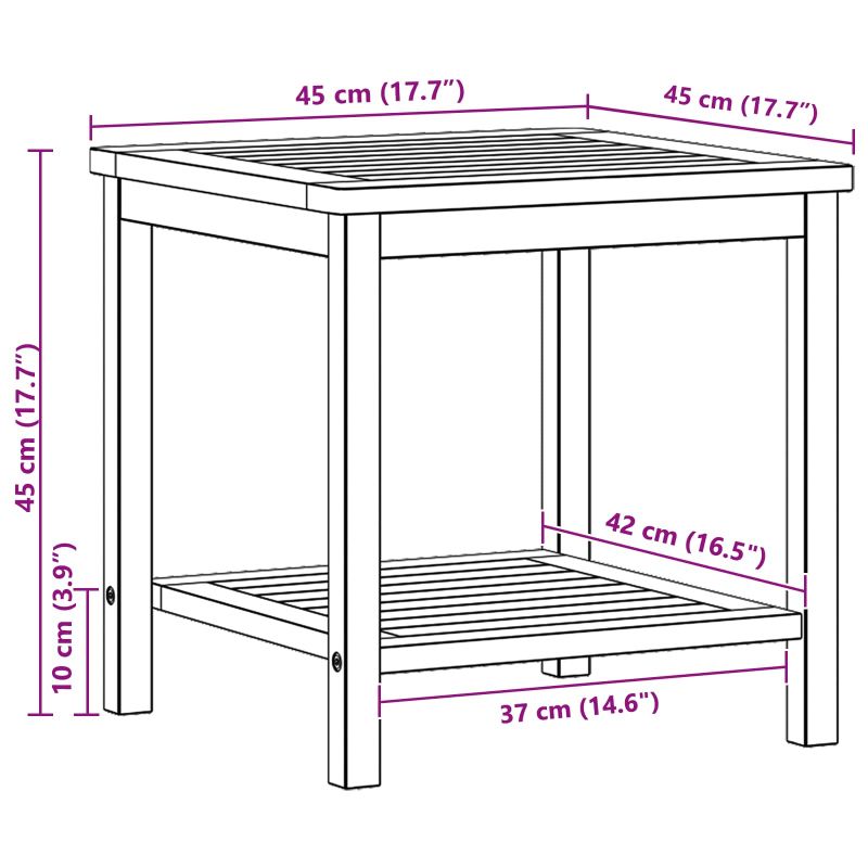 Тази странична маса в градински стил, изработена от масивна акациева дървесина, е идеалният акцент за всяко пространство. Тя съчетава здравина и рустикален чар, внасяща естествена красота в градини, тераси или даже в дома. Стилният ѝ дизайн е подходящ както за модерни, така и за класически интериори. Перфектна е за тези, които търсят функционална елегантност, като поддържа напитки, книги и декорации. Материали: Тази маса е направена от масивна акациева дървесина, известна със своята здравина и привлекателен вид. Така структурата ѝ е перфектна за всекидневна употреба без загуба на чар. Естествените цветове на дървото добавят топлина и стил, подходящи както за рустикални, така и за модерни среди. Включени компоненти: Дизайнът с рафтове и здрава рамка от акация предлага отлична поддръжка за вашите вещи. Краката от масивна акациева дървесина придават стабилност и дълготрайност на масата, като я правят удобна за употреба. Характеристики / Функция / Дизайн: Рустикалният стил на масата лесно се интегрира във всеки интериор, като предлага универсален дизайн, отговарящ на естетическите нужди. Здравата конструкция гарантира, че остава стабилна, независимо от къде я ползвате. Препоръчителни приложения: Идеална за тераси, градини или до басейни, масичката е перфектната платформа за релаксация или социални събирания. Нейният ненатрупан вид позволява многофункционалност, от поставяне на напитки до саксии, правейки я ценен аксесоар за всеки дом. Грижа и поддръжка: Лесно е да поддържате масата в добър вид - просто я избърсвайте с влажна кърпа, за да премахнете праха и замърсяванията. За дълготрайна употреба, насякъде я покривайте при лошо време, за да я защитите през сезоните.