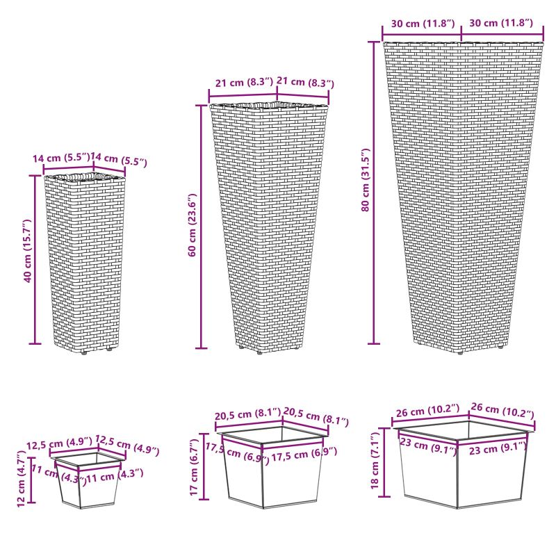 Този комплект високи саксии внася свежа естетика в градината или на терасата. Проектирани да изглеждат добре, те съчетават модерен стил с практичност. Забавната им трапецовидна форма и плетен дизайн придават стил, който допълва всяко открито пространство. Страхотни са за хора, които искат да подобрят атмосферата с лека нотка елегантност. Материали: Изработени от здрав метал, който е устойчива и надежден при всякакви условия навън. Металната конструкция е UV защитена, което осигурява дълъг живот дори под горещото слънце, така че да ви служи дълго. Съдържащи елементи: С премахваеми вътрешни саксии, които улесняват подреждането и грижата за растенията. Сменяйте растенията бързо, без да нарушавате корените. Това спестява време и минимизира безпорядъка, свързан с засаждането. Дизайнерски стил: С плетен модел и блестящо покритие, тези саксии имат модерен стил, който подхожда на съвременните градини. Те съчетават практичност с добър визиен изглед, за да придадат елегантност на откритите пространства. Сезонна употреба: Идеални са от пролетта до лятото. Оптимизирани за сезонно цъфтене, които обединяват грижите с добри условия за растеж. Лесно адаптират се към промените в времето. Грижа и поддръжка: Поддържайте ги в безупречен вид с малко усилия. Просто избърсвайте с влажна кърпа, за да премахнете мръсотията. Лесната поддръжка позволява дълготрайност и привлекателност без да губите много време.