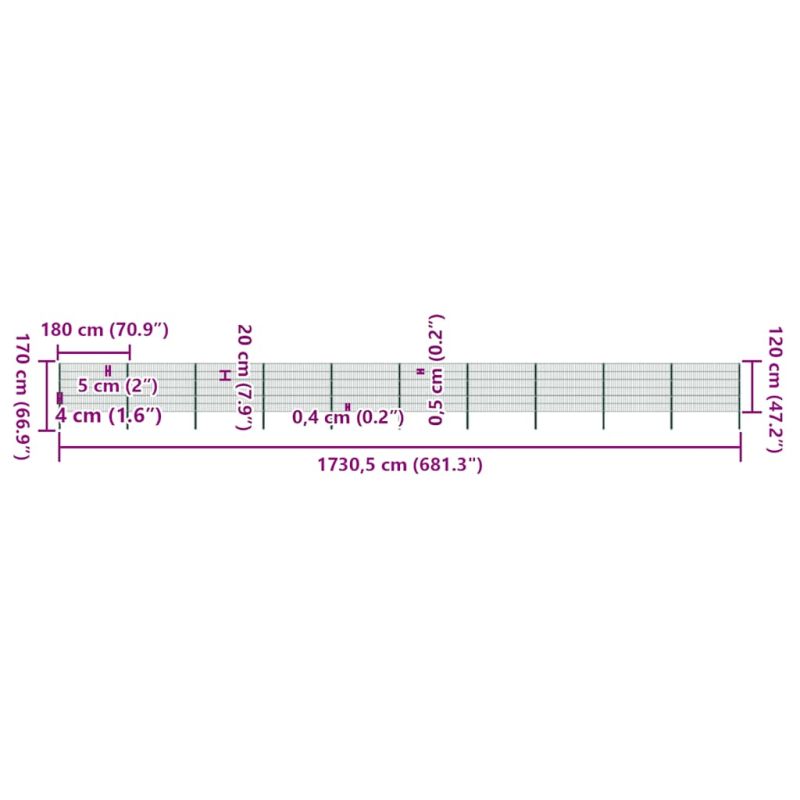 Ограден панел с железни стълбове 1730x120 см, зелен