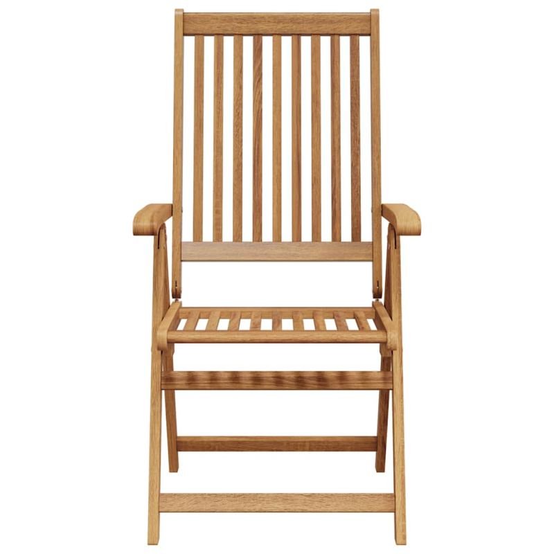 Този комплект дървени градински столове е предназначен да придаде винтидж вид на всяка вечеря във вашата градина, тераса или вътрешен двор. Сгъваемият стол е изработен от акациево дърво масив – тропическа твърда дървесина, което го прави стабилен и издръжлив. Завършената с масло повърхност се почиства лесно с влажна кърпа. Трапезният стол може да се регулира на 5 позиции, като ви осигурява оптимален комфорт при седене. Той може и да се сгъва, за да пести място, когато не се използва. Забележка: За да удължите живота на вашите градински мебели, препоръчваме ви да ги почиствате редовно и да не ги оставяте ненужно на открито без защита.Почистване: Използвайте мек сапунен разтворСъхранение: Ако е възможно, съхранявайте на хладно и сухо място на закрито. Ако продуктът се съхранява на открито, защитете го с водоустойчиво покривало. Избършете и изсушете излишната вода или сняг от плоските повърхности след дъжд или снеговалеж. Позволете достатъчно циркулация на въздуха, за да избегнете повреди, свързани с влагата. Максимално 110 кг на седалка.