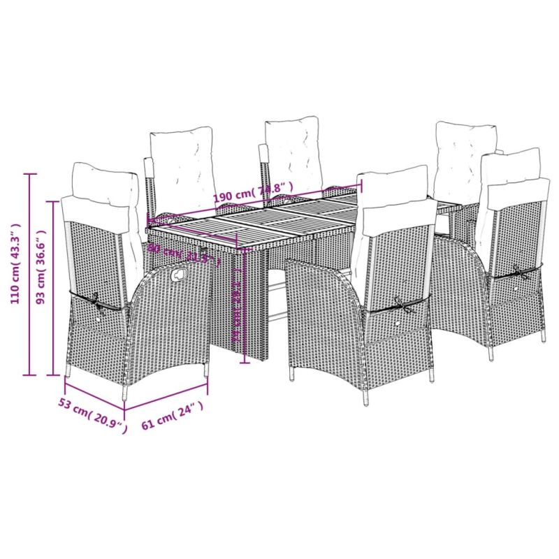 Този градински трапезен комплект е чудесен избор за вечеря на открито или просто за почивка в градината, задния двор или във вътрешния двор. Издръжлив материал: PE ратан, известен също като полиратан, е здрав синтетичен материал с малко необходима поддръжка, който прилича на естествен ратан. Той е лек, лесен за почистване и често се използва за външни мебели поради своята издръжливост и устойчивост на атмосферни влияния.Регулируема облегалка: Този градински стол има дръжка. Можете да регулирате облегалката във всяка позиция чрез издърпване на дръжката и бързо да я върнете в първоначалната ѝ позиция.Удобна седалка: Тази мебел за открито, снабдена с плътно подплатени възглавници, предлага удобство при сядане.Калъф, който може да се сваля и може да се пере: Тези възглавници за седалки имат подвижни калъфи за лесно пране и поддръжка. Възглавниците за облегалките имат калъф отзад за лесно закрепване към облегалките.Стабилен и лесен за почистване плот: Тази градинска маса има плот от акациево дърво, който е здрав, издръжлив и лесен за почистване с влажна кърпа. Добре е да се знае: За да сте сигурни, че вашите външни мебели ще останат красиви, ви препоръчваме да ги защитите с водоустойчиво покривало. Максимално 110 кг на седалка. Съобразете се с риска от открит огън и други източници на силна топлина в близост до продукта.